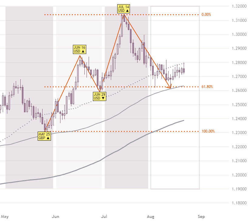 The GBP/USD is currently taking pause from its retracement of the uptrend that tested the 61.80% level near 1.262 and a move below would break the uptrend. The recent moves can be explained as follows: