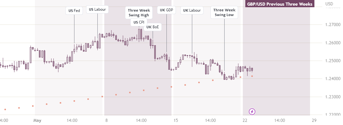 Strength in the US dollar is being held back by the ‘2023 US Debt Ceiling’ narrative and so a resolution of this issue will likely pressure the GBP/USD lower although some pound strength is possible from the central bank divergence. The Bank of England remains committed to higher rates while the Fed have signalled that they are taking a pause. The CME FedWatch Tool indicates an 85% chance of a hold in June, falling to 70% in July. Cuts are being priced in from September although the odds have fallen from 40% to 25%.