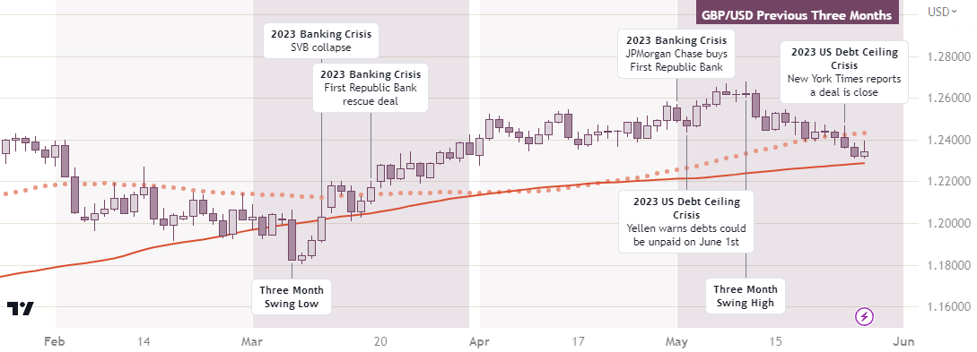 The strength of the GBP in the previous three months was due to a number of factors, including rising expectations that the Bank of England would raise interest rates to combat inflation, as well as concerns about the US debt ceiling. However, sentiment about the debt ceiling has recently improved, and the US dollar has regained some value as a result.