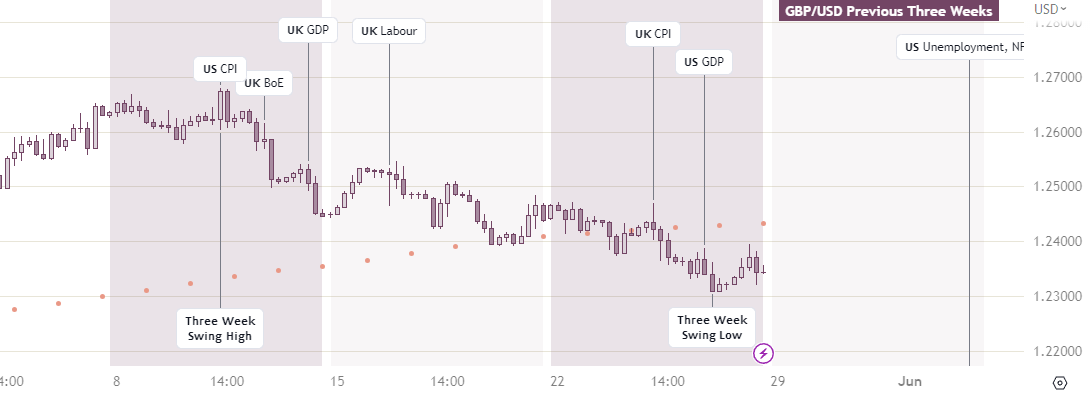 Strength in the US dollar is being held back by the ‘2023 US Debt Ceiling’ narrative and so a resolution of this issue will likely pressure the GBP/USD lower although some pound strength is possible from the central bank divergence. The Bank of England remains committed to higher rates while the Fed have signalled that they are taking a pause. The CME Group 30-Day Fed Fund futures prices indicate that the odds are in favour and rising (65%) of a 0.25% hike in June. The July meeting is being priced in as a hold (50% and rising).