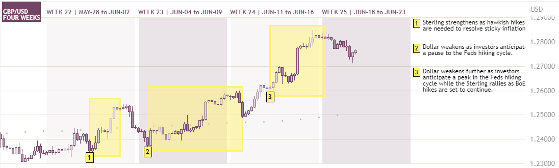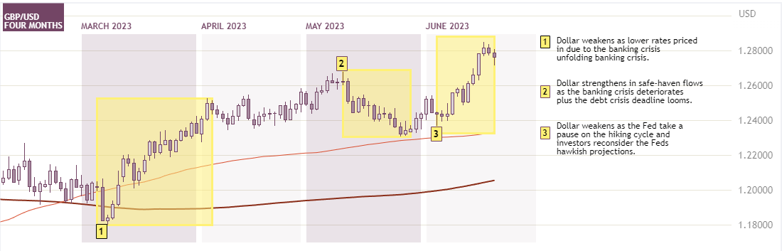 The GBP/USD has risen in the past four months, supported by a weaker dollar. This was driven by investors moving into riskier assets as they reconsidered the hawkish moves by the Fed although there was a brief period in May when the dollar was bought as a safe-haven as the banking crisis deteriorated and the debt ceiling deadline was nearing.