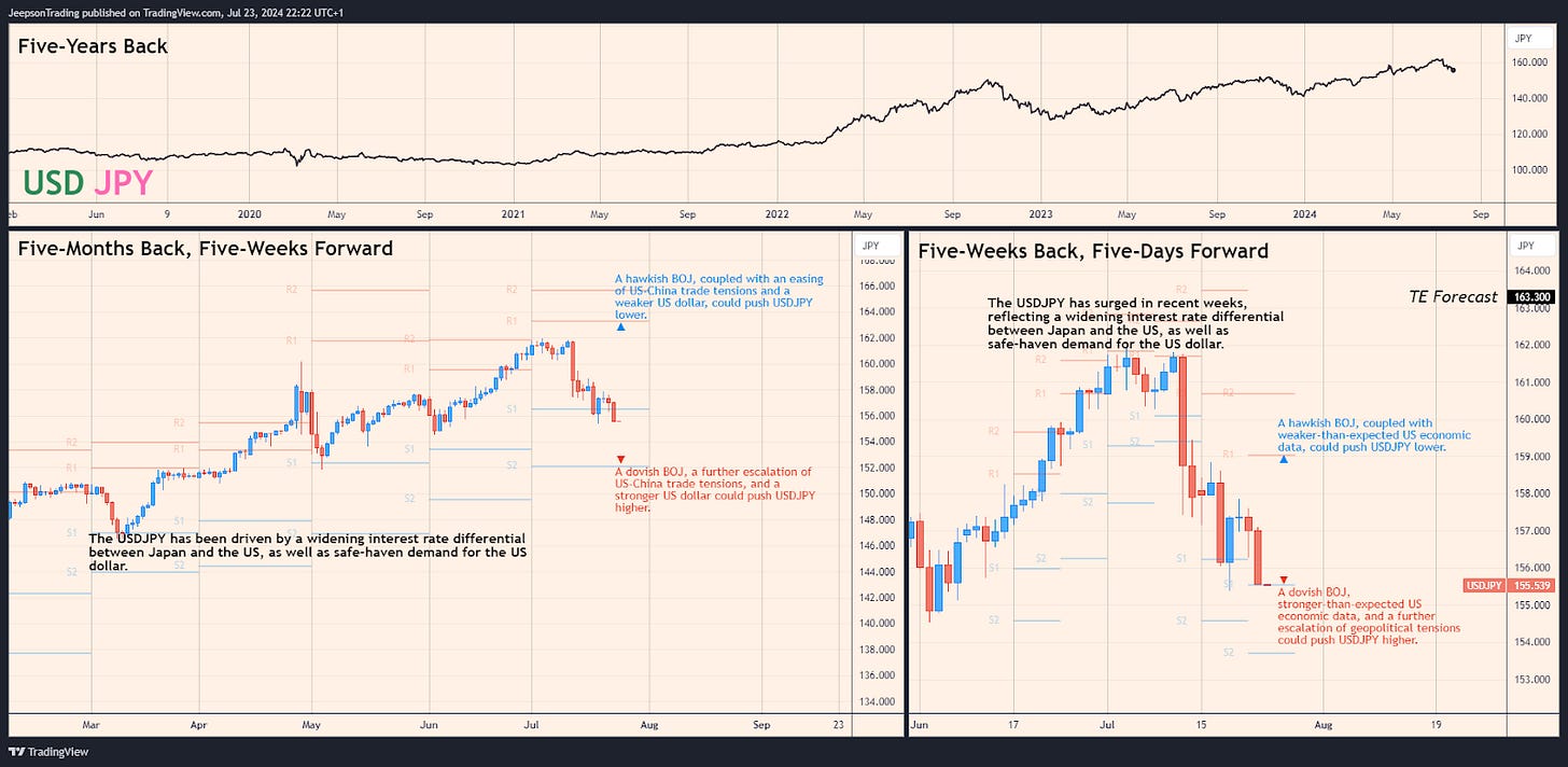 The USDJPY has been on a relentless upward march over the past five weeks, surging from around 156 to a peak above 159 in early July, driven by a widening interest rate differential between Japan and the US, as well as safe-haven demand for the US dollar amid escalating geopolitical tensions. The yen's weakness has been particularly pronounced against the backdrop of a more hawkish Federal Reserve and concerns about a Chinese economic slowdown. The BOJ's decision to tweak its yield curve control policy in June did little to stem the yen's slide, as market participants remain sceptical about the BOJ's willingness to tighten monetary policy significantly.