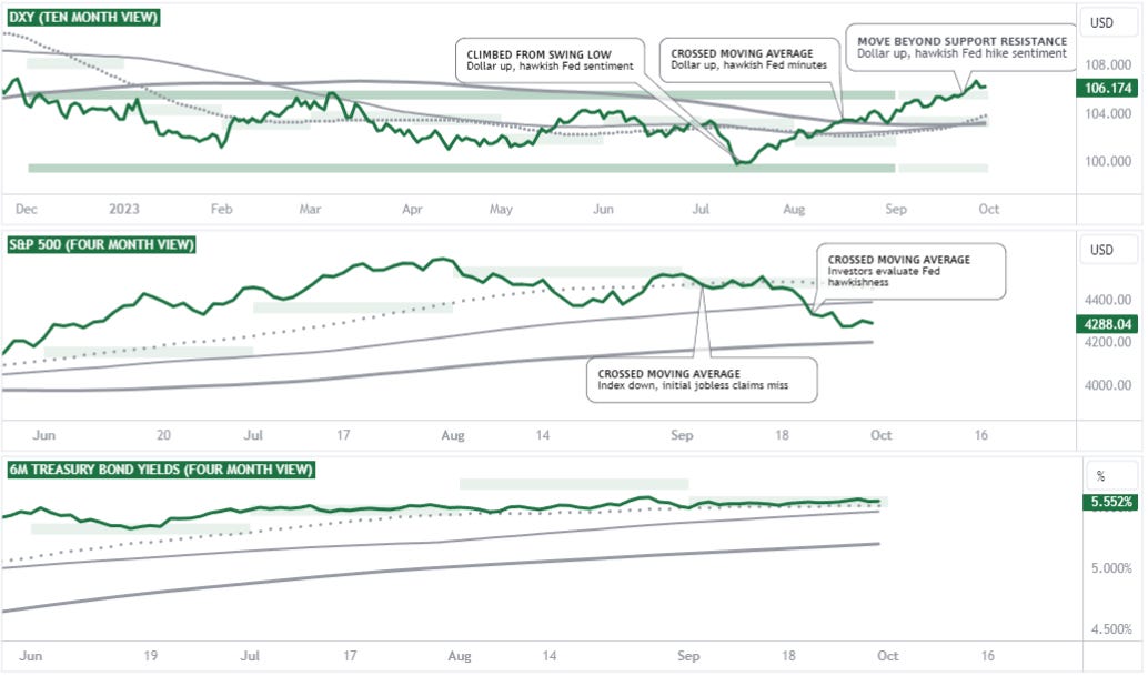 US Dollar Outlook Bullish as US Economy Slows, Inflation Remains High: The Fed kept interest rates at 5.50% in September, but said it is still committed to bringing inflation back to 2%. The US economy is growing at a slower rate but remains strong. Macroeconomic signals suggest a bullish outlook for the US dollar, as inflation remains above target which will require rates to remain higher for longer. Geopolitical events, such as the war in Ukraine and the US-China trade war, are also adding uncertainty and putting upward support on the value of the dollar.