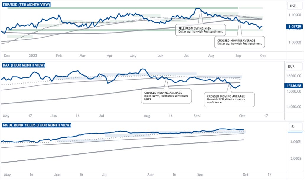 Euro Outlook Mixed as EA Economy Slows but Interest Rates Rise: The European Central Bank raised interest rates to 4.50% in September, signalling its commitment to bringing inflation back to 2%, even if it means slowing economic growth. The euro area economy has slowed but still has a cautiously optimistic outlook, with recent GDP contractions expected to recover and unemployment expected to remain steady. Macroeconomic signals suggest a mixed outlook for the euro, as the economy is slower than before and although inflation has fallen it still remains high. Geopolitical events, such as the gas dispute with Russia and the war in Ukraine, are also adding uncertainty and putting downward pressure on the value of the euro.