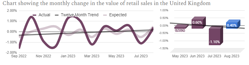 UK sales have declined steadily over the past four months, reversing the gradual improvements seen over the previous year. This is a sign of a slowing economy, as consumers tighten their belts amid the cost of living crisis and rising interest rates.