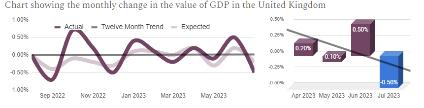 The UK GDP monthly rate report measures the change in value of goods and services produced in the UK over a given month compared with the previous. The latest data covers the July period and was published on September 13th by the Office of National Statistics and the next version is out on October 12th.
