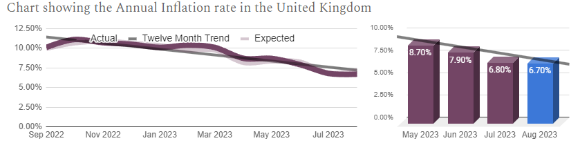 The interest rate of the UK was held at the September meeting after being hiked by 0.25% in August and throughout the previous twelve meetings. This indicates that the Bank of England is hawkish but have become cautious so as to avoid affecting growth. Trading Economics forecast 5.25% to be the peak rate and 2024 to see cuts of 0.75%.