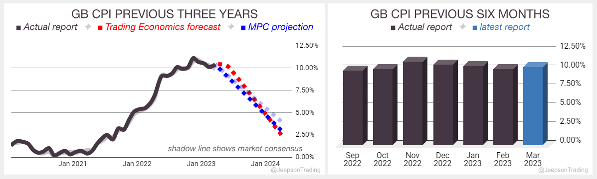 Headline CPI in the UK fell to 10.1% inflation in March, higher than the 9.8% expected and remaining close to the forty-year high but below the previous 10.4%. The significant movers were Food and non-alcoholic beverages climbing from 18.0% to 19.1% while transport fell from 2.9% to 0.8%.