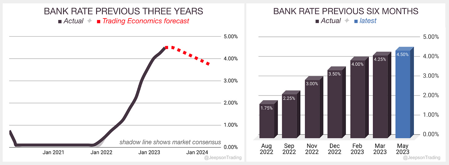 The Bank Rate was hiked by 0.25% in May to 4.50%, matching the 0.25% hike in March