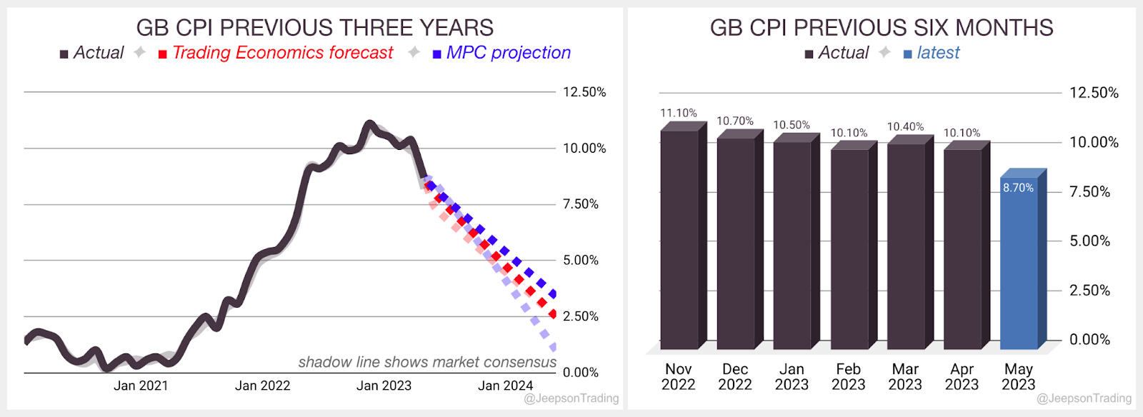 The MPC has a projection of 8.2% for Q2 with a fall to 3.4% in Q2 2024. Trading Economics are forecasting 8.0% in Q2. The April report is due on Wednesday the 21st of June.