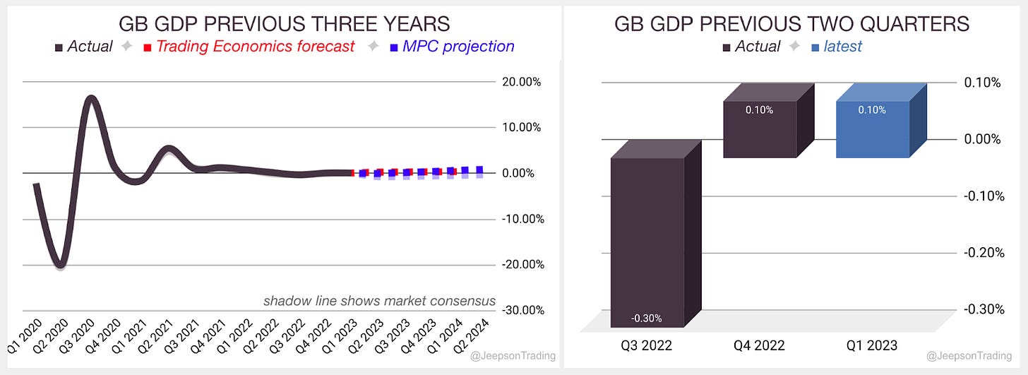 The MPC projects growth to expand by 0.9% in 2024, up from -0.3% previously. Trading Economics forecasts Q2 growth of 0.3%, up from 0.2% previously. The Q1 2023 final report is due on Friday the 30th of June.