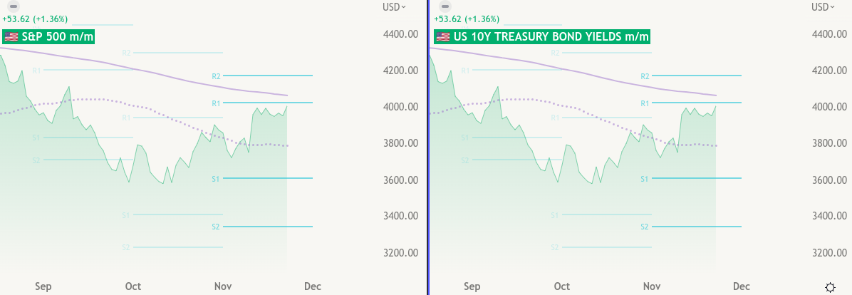 The sentiment narrative that is driving the market is the belief that the Fed will pivot. The expected effects of this are for upside moves on the S&P 500 and downside moves on treasury yields.