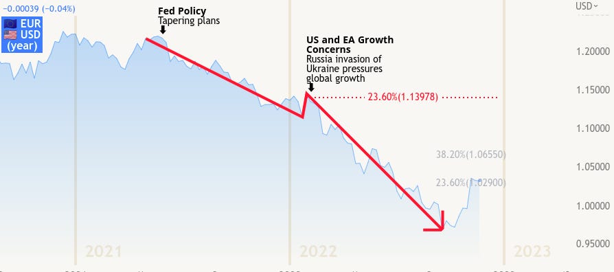 The long term view (year on year) shows that the EUR/USD has been downtrending since last year, which began in mid-2021 when the Federal Reserve began to comment on tapering off its stimulus plan.