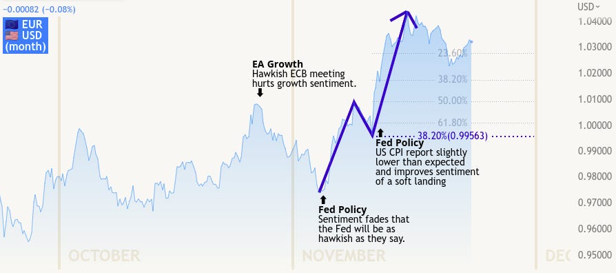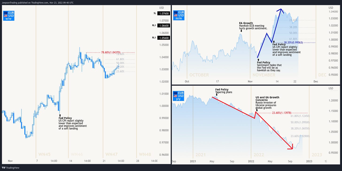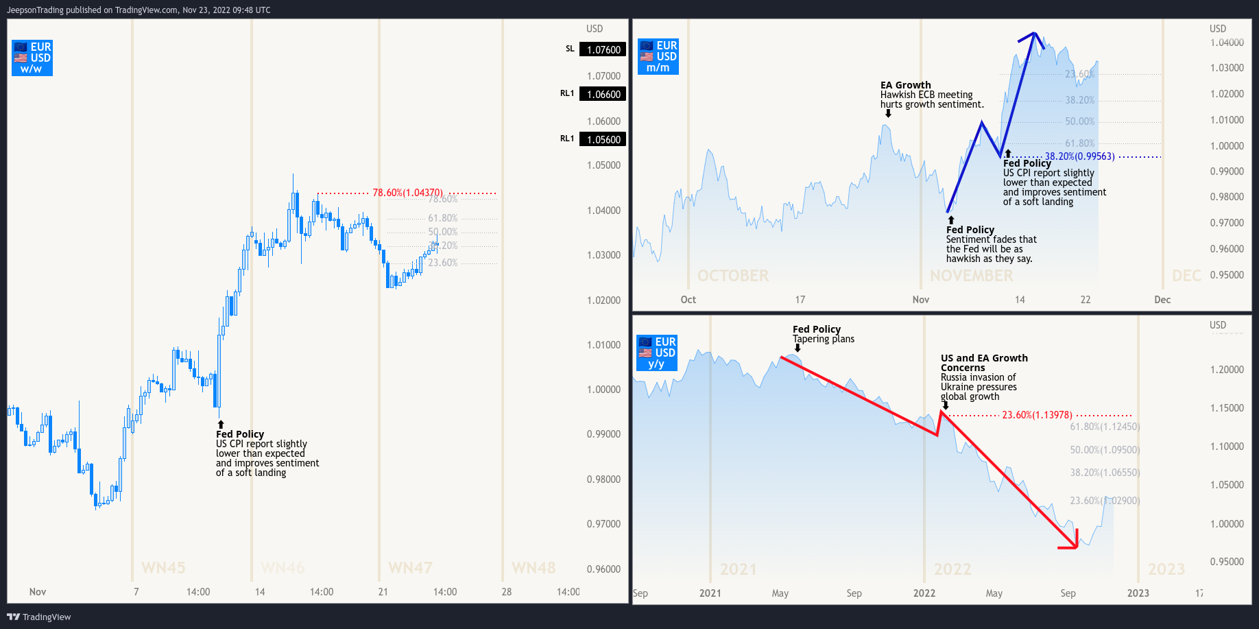 The short term view (month on month) shows that the EUR/USD has been uptrending since the start of the month (November) when the Fed hiked rates and made hawkish comments but the market still believes it will pivot.
