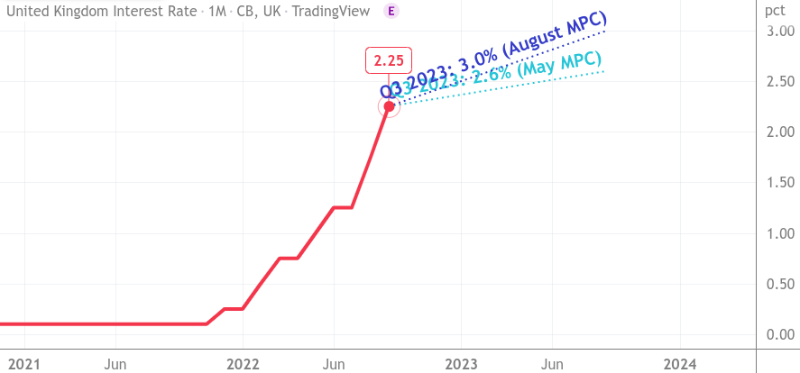 The Bank Rate Rate was hiked by 50bps on the 22nd of September to 2.25 percent. The next meeting is on Thursday the 3rd of November and the long term outlook is for hawkish hikes.