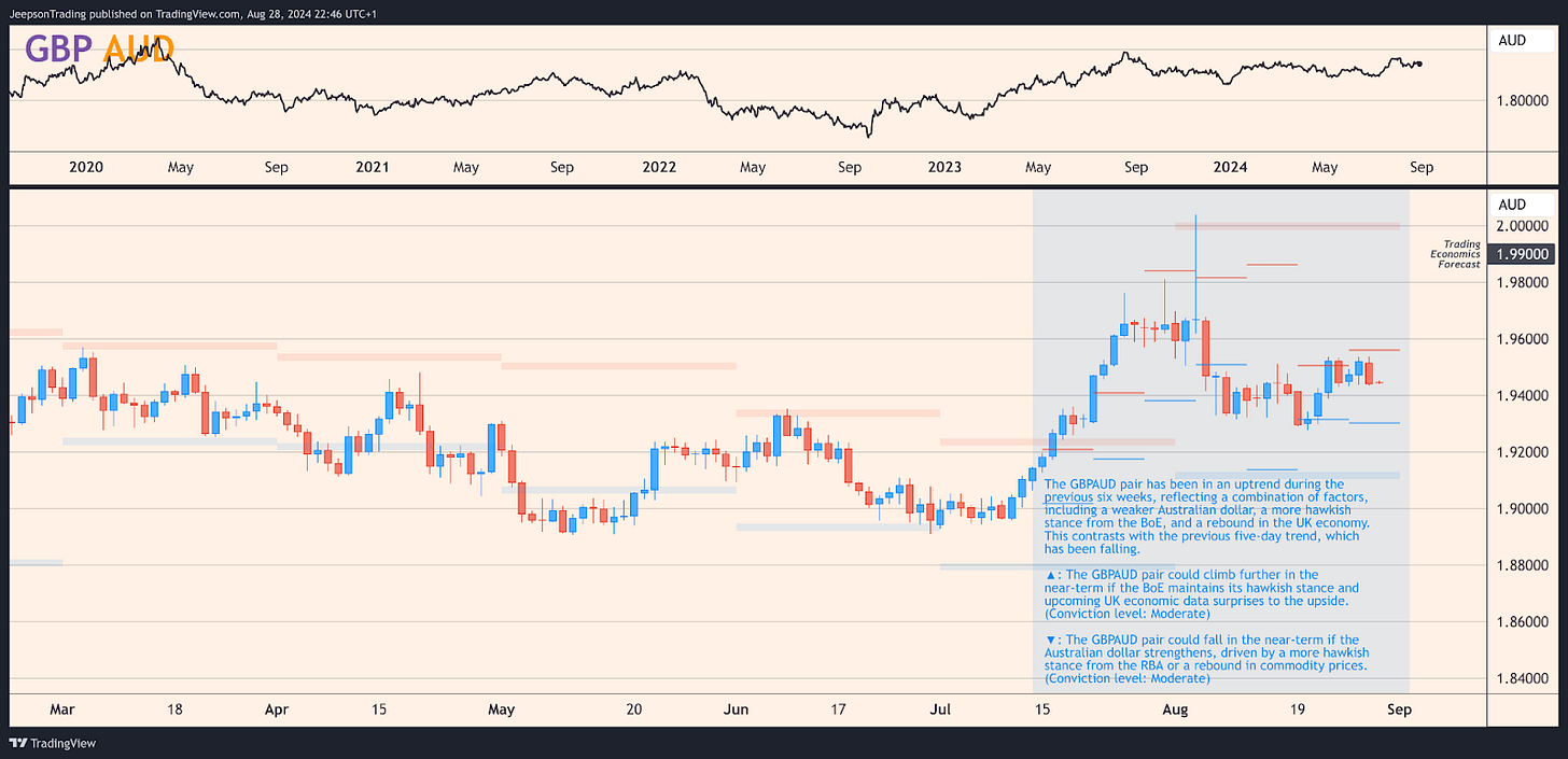 ▼: The GBPAUD pair could fall in the near-term if the Australian dollar strengthens, driven by a more hawkish stance from the RBA or a rebound in commodity prices. (Conviction level: Moderate)
