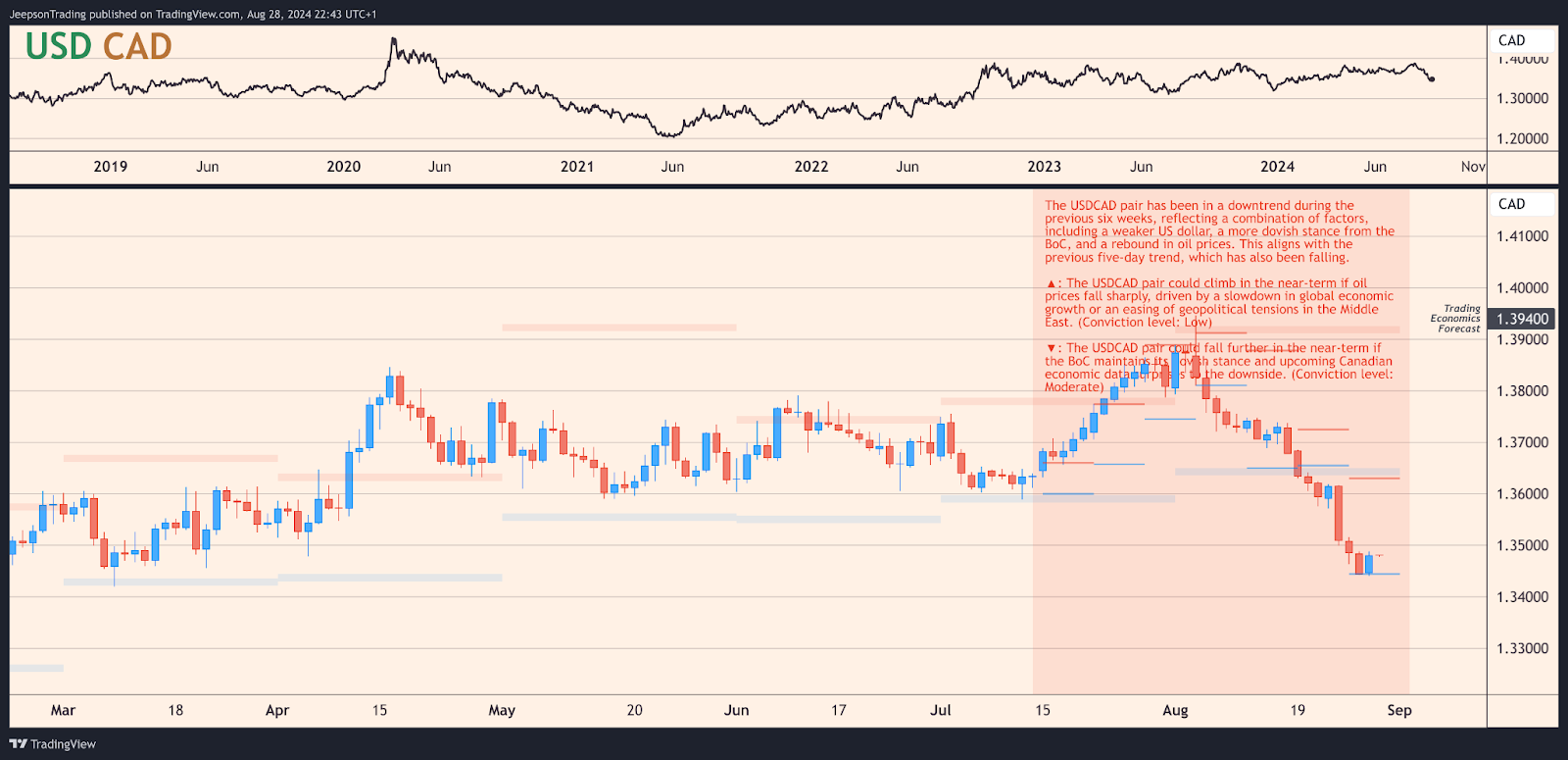 ▲: The USDCAD pair could climb in the near-term if oil prices fall sharply, driven by a slowdown in global economic growth or an easing of geopolitical tensions in the Middle East. (Conviction level: Low)