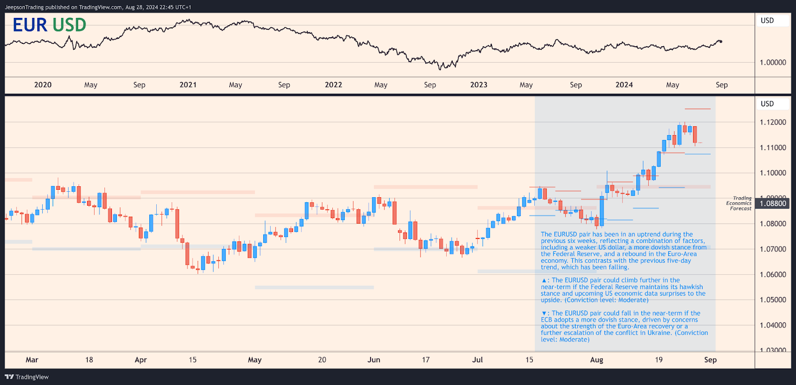 ▲: The EURUSD pair could climb further in the near-term if the Federal Reserve maintains its hawkish stance and upcoming US economic data surprises to the upside, particularly the August jobs report and the July PCE inflation data. (Conviction level: Moderate)