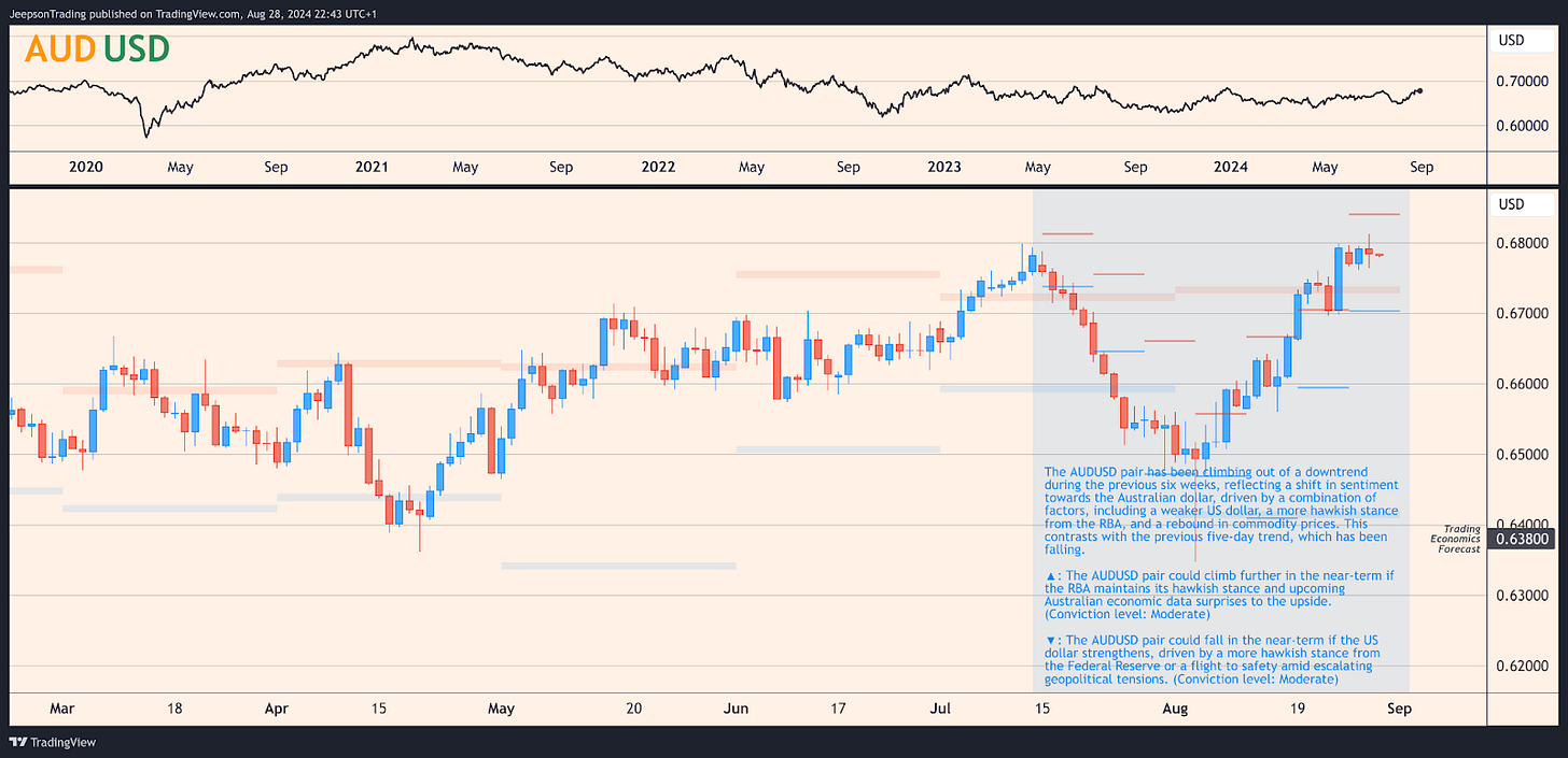 ▼: The AUDUSD pair could fall in the near-term if the US dollar strengthens, driven by a more hawkish stance from the Federal Reserve or a flight to safety amid escalating geopolitical tensions. (Conviction level: Moderate)
