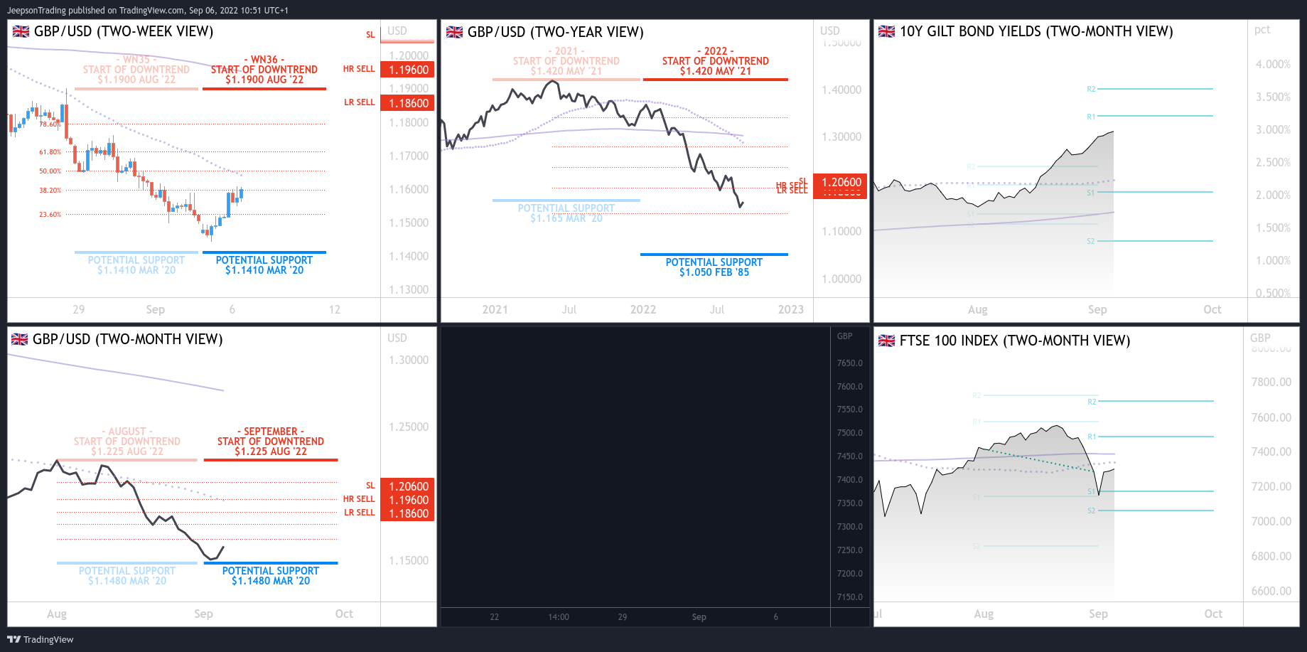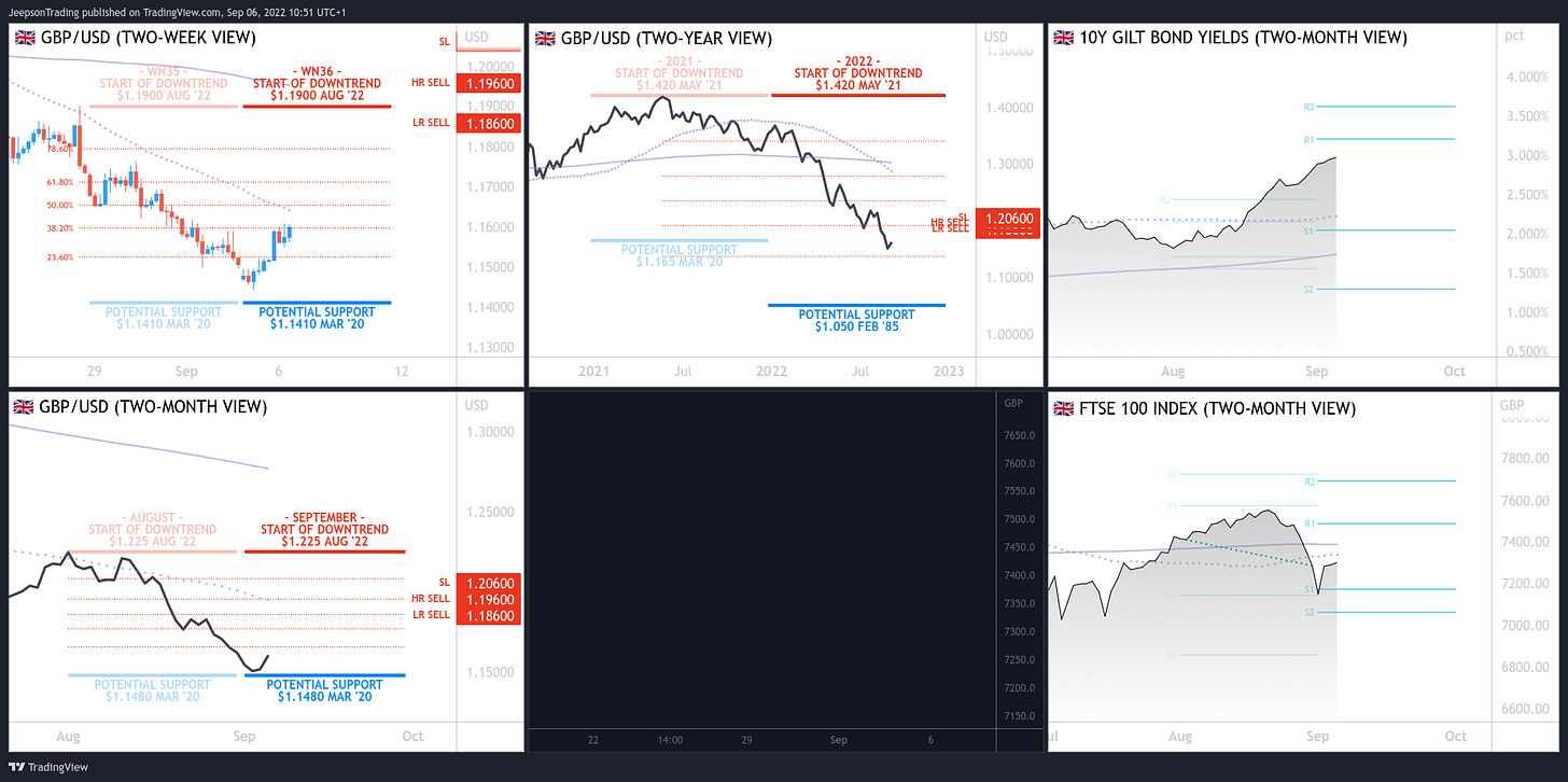 This week is likely to see information on her policies to tackle the cost of living crisis. When observing a two-week view, the GBP/USD has retraced from its recent lows and is testing the 38.2% fib level when observing the two-week view. There have been no previous retracements so a move back towards the start of the downtrend at 1.19 is possible if the optimism continues.