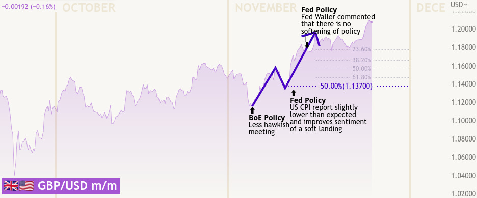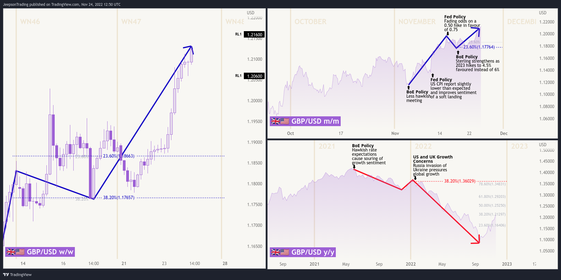 The short term view (month on month) shows that the GBP/USD has been uptrending since the start of the month (November) when the BoE hiked rates but commented that markets had priced in higher rates than may be required.