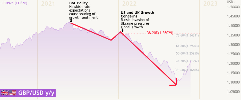 This fall in GBP/USD was pressured further as safe haven flows into the US dollar picked up this year in February 2022 as Russia invaded Ukraine. The subsequent sanctions that followed and lack of supply to the energy markets pushed global inflation higher than had been anticipated and central banks have had to tighten at a record pace. This has lowered global growth which keeps the USD higher and GBP lower.
