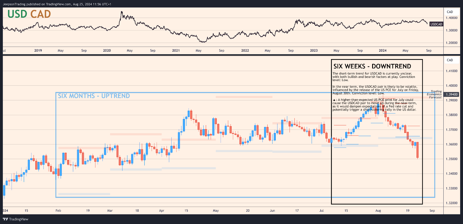 In the near term, the USDCAD pair is likely to be volatile, influenced by the release of the US PCE for July on Friday, August 30th. Conviction level: Low.
