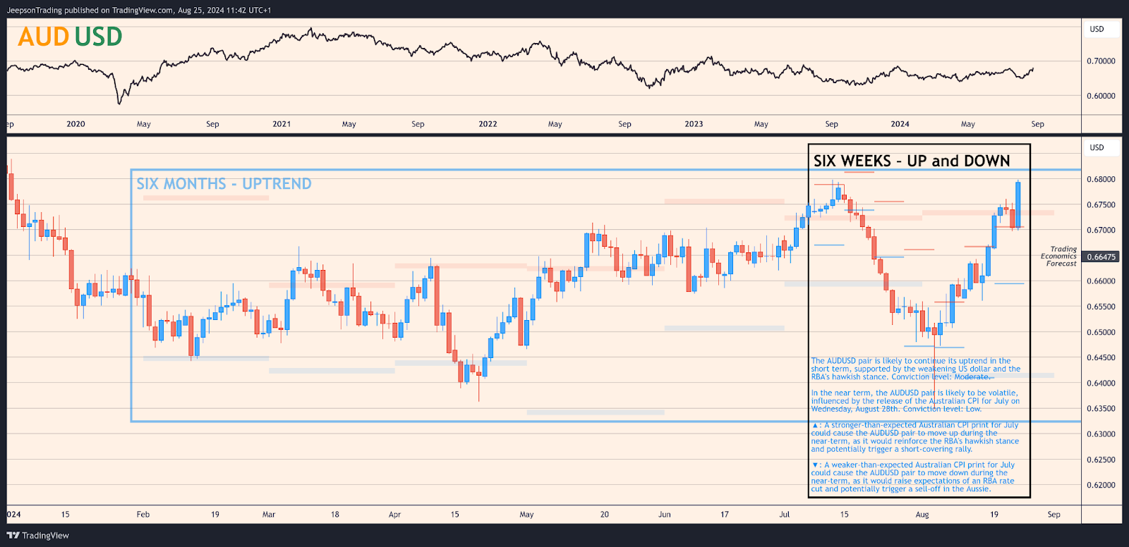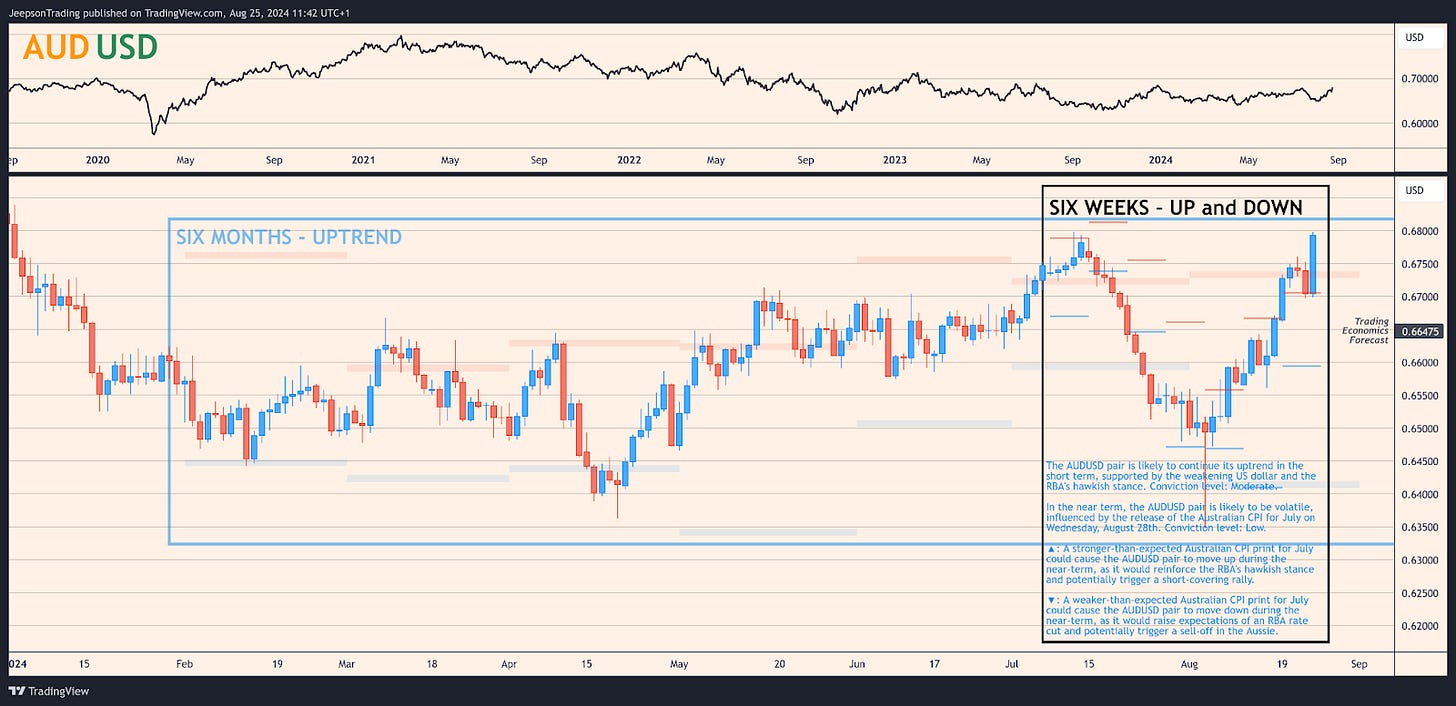 In the near term, the AUDUSD pair is likely to be influenced by the release of the Australian CPI for July on Wednesday, August 28th. A weaker-than-expected CPI print could trigger a sell-off in the Aussie, as it could raise expectations of an RBA rate cut. Conversely, a stronger-than-expected CPI print could support the Aussie, as it would reinforce the RBA's hawkish stance.
