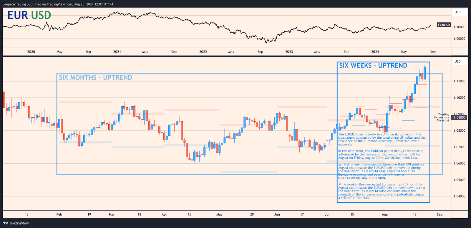 The EURUSD pair has been climbing during the five days leading up to Sunday, August 25th, 2024, and is in an uptrend over the six weeks prior. This suggests that the recent positive momentum is consistent with the longer-term trend.