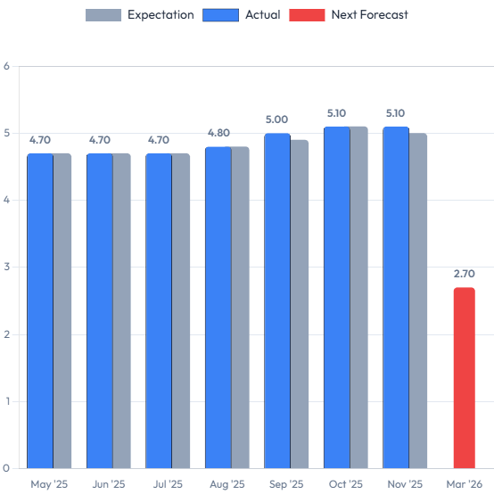 Consensus / Long Term Views: The labor market is clearly cooling. Consensus expects the rate to hold at 5.10 percent for now, but long-term models see it peaking slightly higher at 5.30 percent in early 2026 before recovering to around 4.50 percent by 2028.