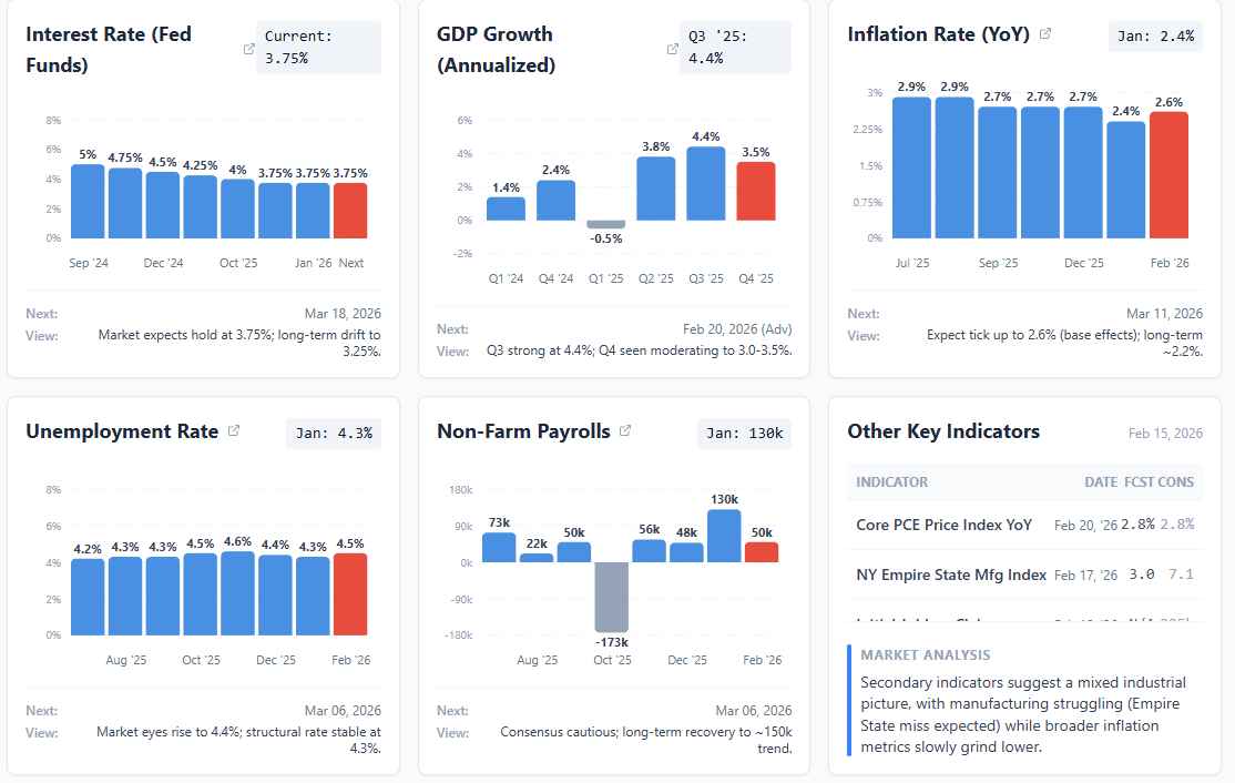 The quantitative data reveals a highly volatile economic engine that is re-accelerating after a stumble in early 2025. January’s strong NFP (130K) and drop in Unemployment (4.3 percent) contradict the recessionary signals from late 2025, suggesting resilience. However, the persistence of above-target core inflation (2.5 percent) and Interest Rates (3.75 percent) confirms that the Fed cannot ease further without risking price stability. Meanwhile, headline inflation eased to 2.4% in January, offering some respite. The data supports a “higher for longer” USD thesis.