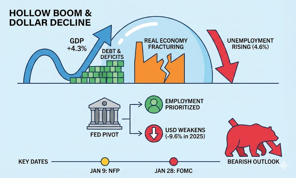 The United States enters 2026 in a state of “Hollow Boom”—GDP is robust at 4.3 percent, driven by government deficits and debt, while the real economy of labor is fracturing with unemployment rising to 4.6 percent. The Federal Reserve is pivoting to ease, prioritizing employment over its 2 percent inflation target, which has weakened the USD (-9.6 percent in 2025). The combination of fiscal dominance, political pressure on the Fed, and a cooling labor market favors a bearish structural outlook for the Dollar. Key Dates: Non-Farm Payrolls (January 9) and FOMC Rate Decision (January 28).