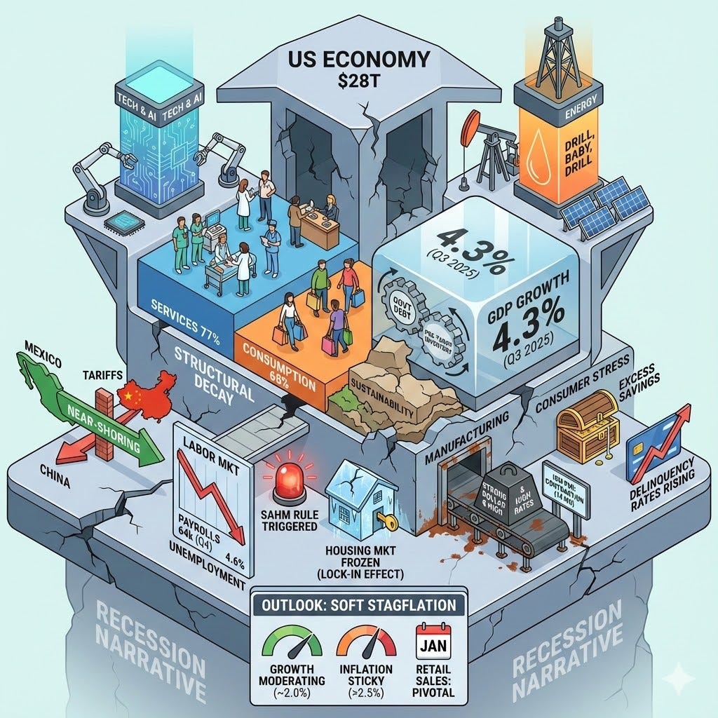 Over the previous seven months, the economy has displayed what I call a “hollow boom.” Headline GDP growth accelerated to 4.3 percent annualized in Q3 2025, which on the surface looks fantastic. However, when you dig deeper, this growth was largely driven by government deficit spending and pre-tariff inventory building by corporations fearing future import costs—neither of which is sustainable organic growth. Beneath this shiny surface, the labor market has deteriorated significantly. Non-farm payrolls averaged a weak 64,000 in Q4 2025, down from over 200,000 earlier in the year, and the unemployment rate rose to 4.6 percent. This divergence suggests growth is being fueled by debt and productivity gains (AI) rather than broad-based labor participation. The private sector is not hiring at a rate sufficient to absorb new entrants to the workforce, and the “Sahm Rule” recession indicator has been triggered, signaling that a downturn is likely already underway despite the positive GDP prints (https://www.bls.gov/news.release/archives/empsit_01102025.pdf).