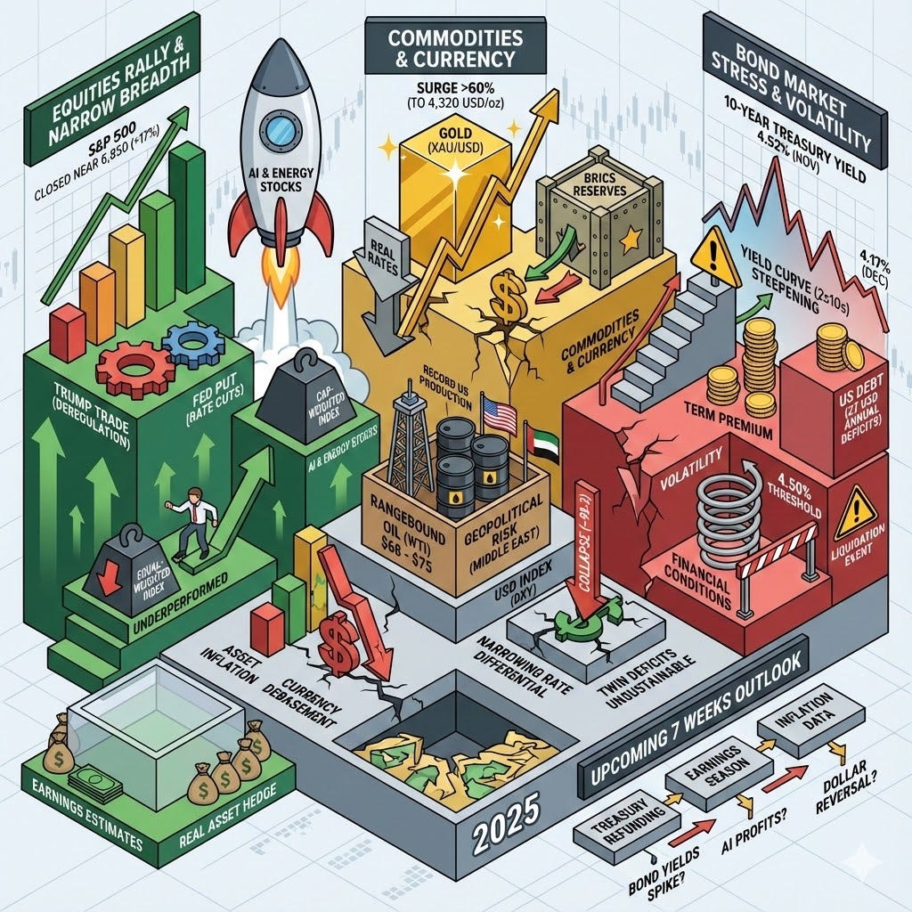 The US stock market, represented by the S&P 500, gained nearly 17 percent in 2025, closing the year near 6,850. The rally over the previous seven months was largely driven by the “Trump Trade” (deregulation) and the “Fed Put” (rate cuts). However, it is crucial to note that market breadth is incredibly narrow, concentrated almost entirely in AI and energy stocks. The equal-weighted S&P 500 has significantly underperformed the cap-weighted index, indicating that the average stock is not performing nearly as well as the headline figures suggest. The recent divergence between rising stock prices and a falling USD is a classic signal of asset inflation driven by currency debasement rather than pure organic growth. Investors are essentially treating stocks as a “real asset” hedge against the loss of purchasing power in the currency, piling into equities even as earnings estimates flatten out (https://tradingeconomics.com/united-states/stock-market).