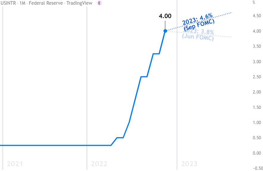 On the 2nd of November, the Federal Funds Rate was hiked by 75bps to between 3.75 and 4.00 percent. This matched the market expectations and also matched the previous hike at the September meeting.