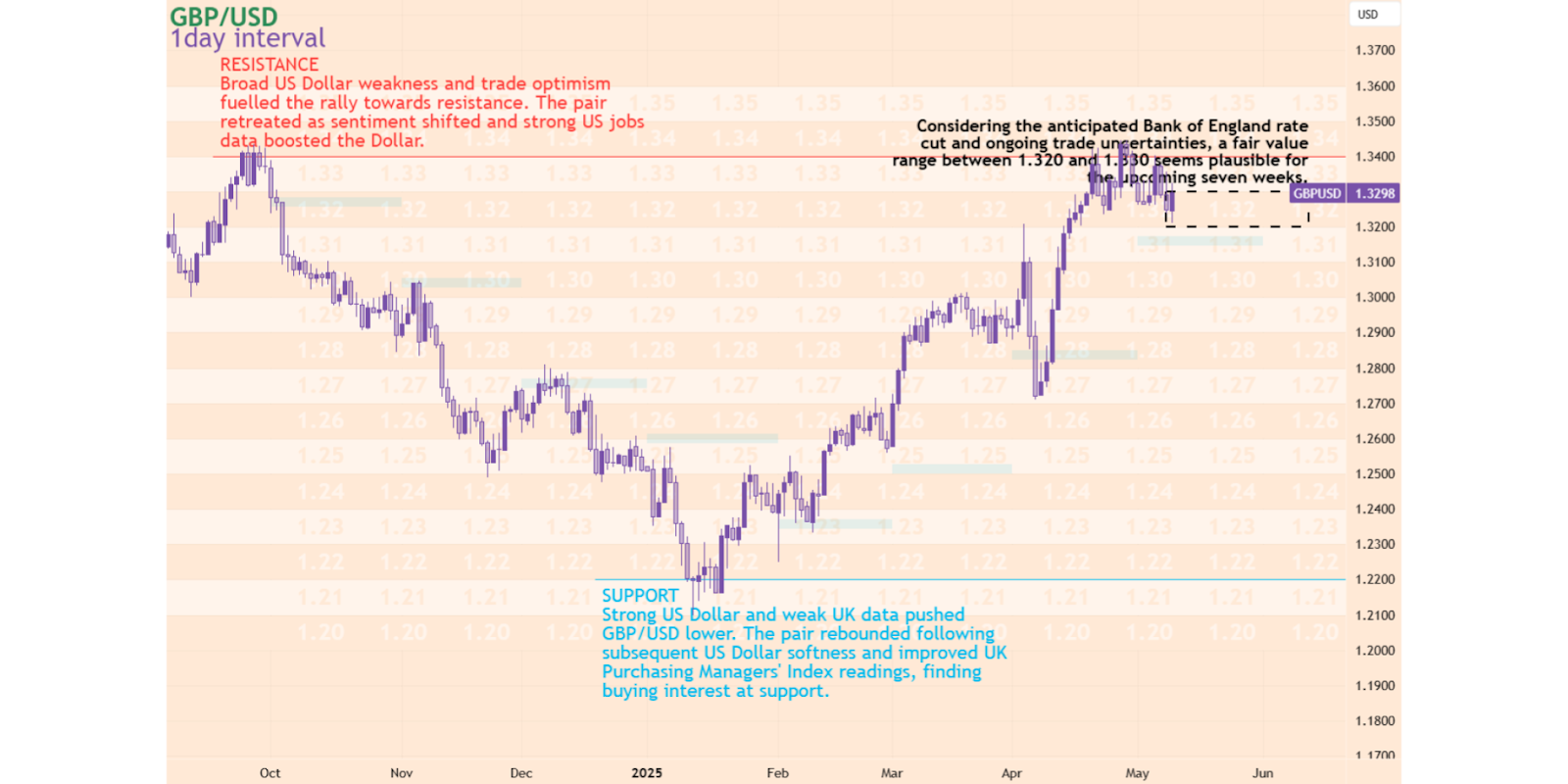 Over the last seven weeks, the Pound's value has been pushed around by changing guesses about what the BoE will do with interest rates, and by the effects of what's happening with global trade. The BoE’s decision to cut rates on May 8th, even though the vote was a close 5-4 (which kind of cooled expectations for more quick cuts), really showed the bank is nervous about the economy. The UK economic news has been a mixed bag: April PMIs were weak, but March retail sales were strong, and Q4 GDP held up. A US-UK trade framework announced in early May was a small plus, but bigger trade worries are still a major drag.