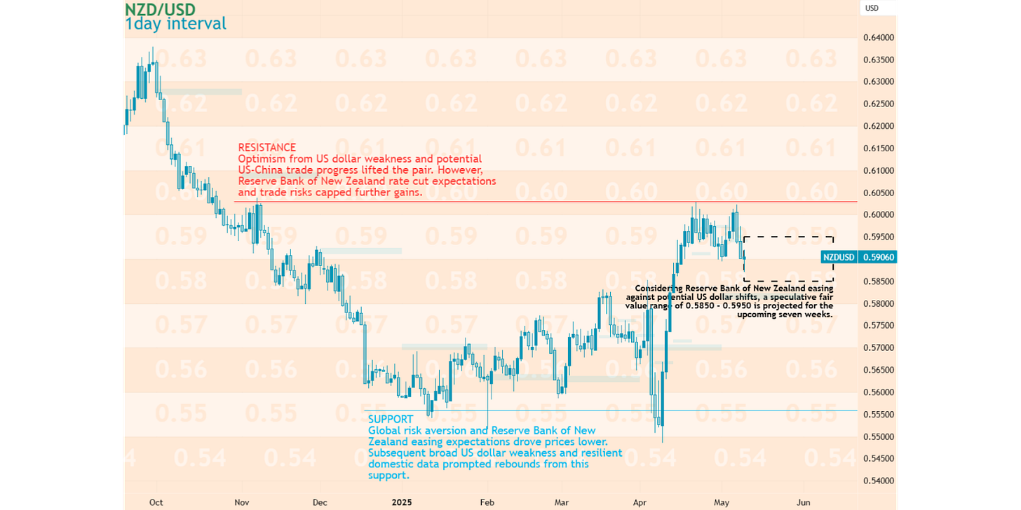 Over the last seven weeks, the NZD has really been pushed around by US Dollar movements, changes in how risky the world feels (especially with US-China trade stuff), and a growing belief the RBNZ will ease its policy. The RBNZ already cut rates back in April. Bad news from New Zealand, like a sharp drop in April's ANZ Business Confidence which blamed US tariff worries, added to the downward pressure on the currency, even though March's building permit numbers did look okay. And while the NZX 50 stock market rallied on general trade optimism, the currency itself lagged behind.