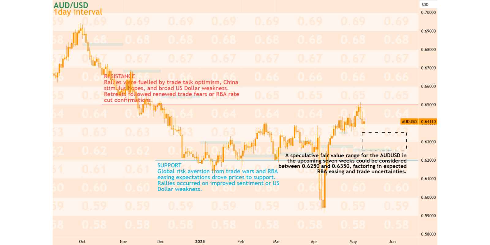 Over the past seven weeks, the AUD has really reacted to global risk appetite, especially to US-China trade news, given Australia's strong trade ties with China. The currency often gained when trade optimism rose but fell when tensions flared or when Aussie data, like weaker-than-expected Q1 core inflation, pointed to an RBA rate cut. Economic news from China has also been a big factor; strong Chinese exports in April offered some support, though concerns about iron ore demand lingered due to falling prices and a drop in a key shipping index.