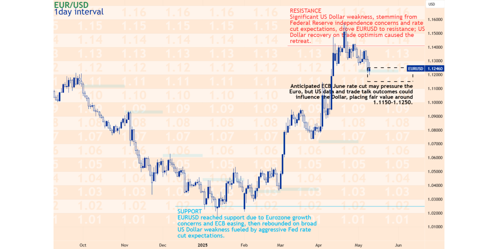 This week, the Euro's direction will likely come down to how the US-China trade talks affect overall market mood and how ECB policy stacks up against the US Fed's, particularly after the US inflation (CPI) data. Key numbers from the Eurozone to watch include Germany's May ZEW Economic Sentiment on the 13th, and then on the 15th, the second look at Eurozone Q1 GDP and March industrial production. There are also Eurogroup and ECOFIN meetings on the 12th and 13th covering longer-term topics like the Banking Union and digital euro. Weaker ZEW figures or a lower GDP reading could pull the Euro down, while more good news could give it a boost. The European Commission's Spring 2025 Economic Forecast, due mid-May, will also be important for sentiment. Trading Economics sees the EUR/USD at 1.13 by quarter-end and the ECB rate at 1.90%.