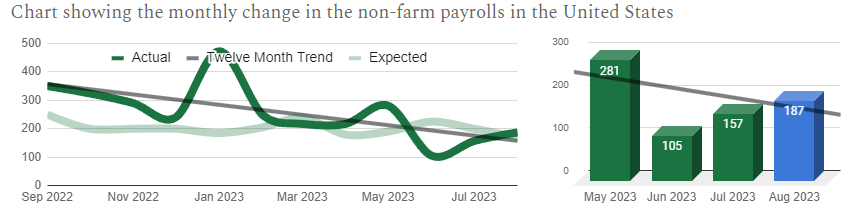 The US non-farm payrolls (NFP) report measures the change in the number of paid workers not employed by farms (due to seasonality) over a given month compared with the previous. The latest data covers the August period and was published on September 1st by the Bureau of Labor Statistics and the next version is out on October 6th.