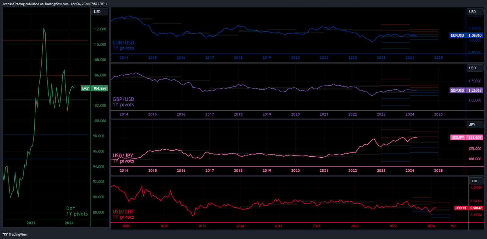 Saturday, April 6, 2024 (Week 14): The US dollar navigates a mixed landscape of robust labour markets, persistent inflation, and anticipated Fed rate cuts. The euro faces headwinds amid growth concerns and a dovish ECB outlook, while sterling's path hinges on the UK's inflation fight and growth prospects. Japan's yen seeks balance as the BoJ cautiously normalises policy amid economic recovery.