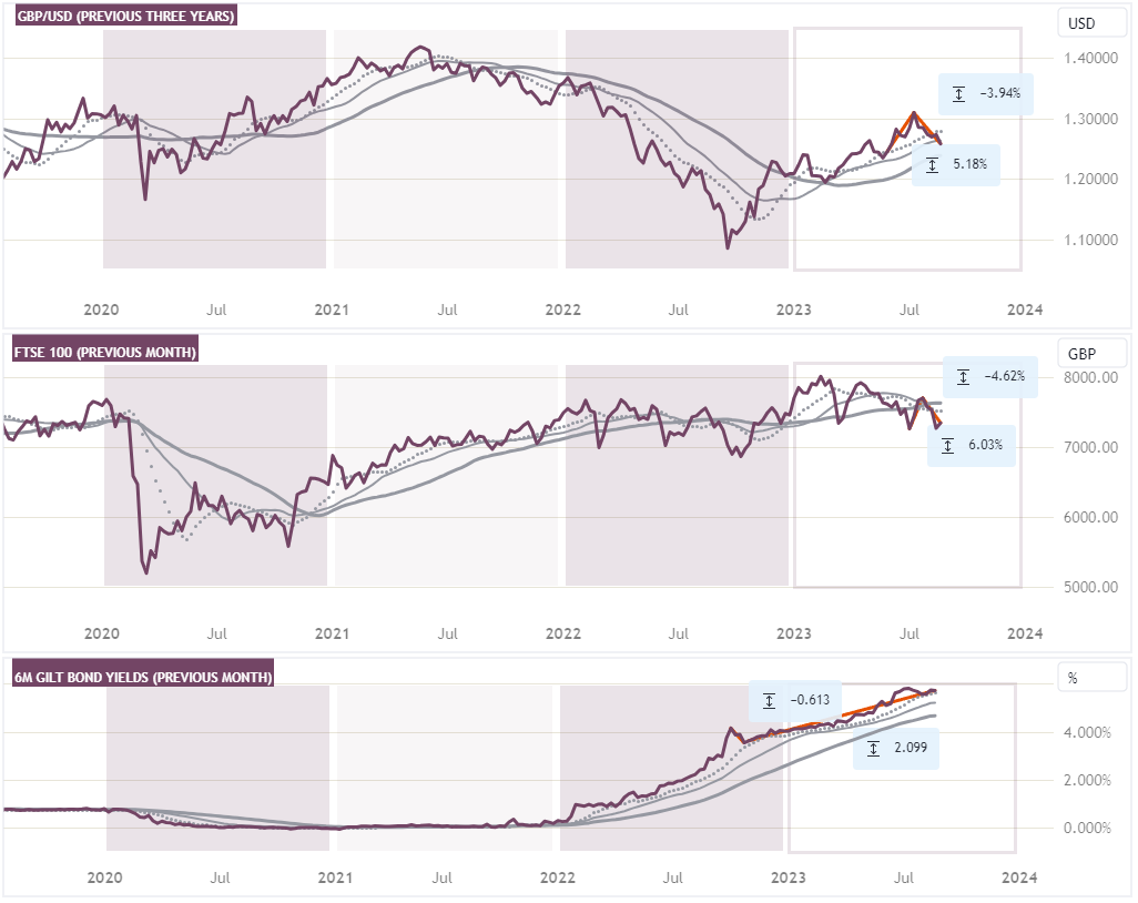 Six month Gilt yields have gained 2.0% since October 2022 after it declined 0.6% in the one month prior.