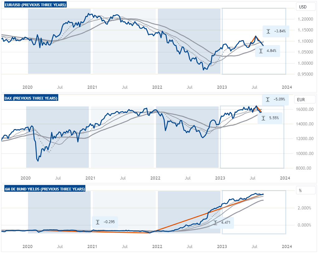 DAX has declined 5.0% since July after it had gained 5.5% in the one month prior.