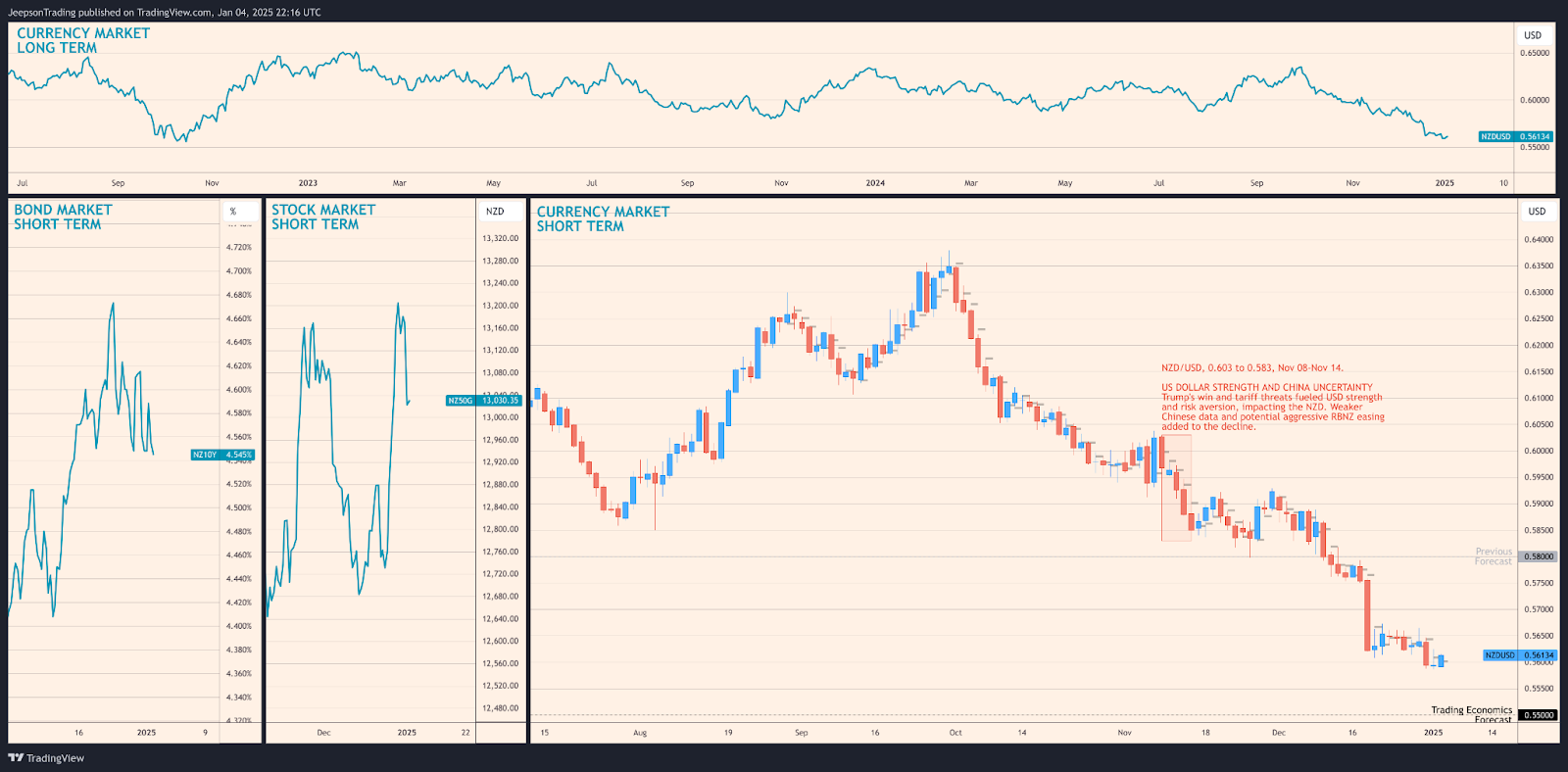 NZD/USD: Trading Economics forecasts 0.55 by the end of Q1 2025 and 0.53 in 12 months. These forecasts seem realistic given the current economic and political climate.