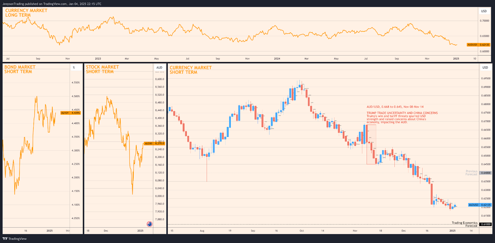 AUD/USD: Trading Economics forecasts 0.61 by the end of Q1 2025 and 0.59 in 12 months. These forecasts seem realistic given the current economic and political climate.