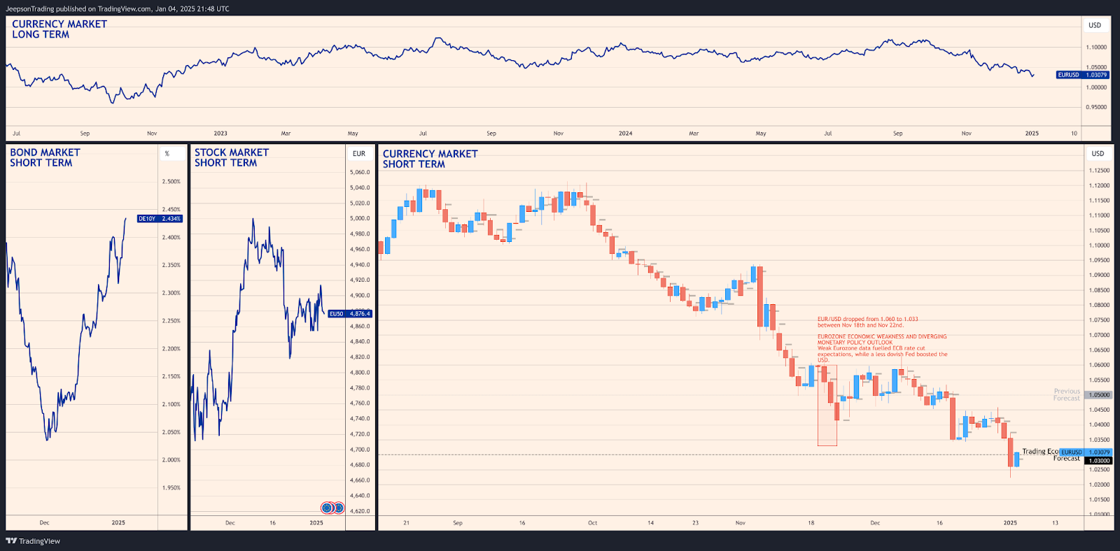 07-Jan-2025: EA Core Inflation Rate YoY Flash DEC (Forecast: 2.70%, Previous: 2.70%). Steady core inflation might not significantly impact the EUR, as the market is focused on the ECB's broader policy direction.