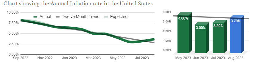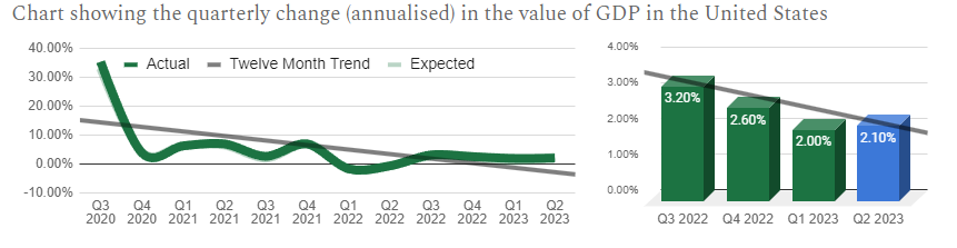The interest rate of the US was held at the September meeting after being hiked by 0.25% in July and throughout most of the previous twelve meetings. This indicates that the Federal Reserve is hawkish but has become cautious as inflation has been falling quickly and they want to avoid affecting growth. Trading Economics forecast 5.50% to be the peak rate and 2024 to see cuts of 0.25%.