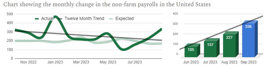 The US non-farm payrolls (NFP) report measures the change in the number of paid workers not employed by farms (due to seasonality) over a given month compared with the previous. The latest data covers the August period and was published on October 6th by the Bureau of Labor Statistics and the next version is out on November 3rd.