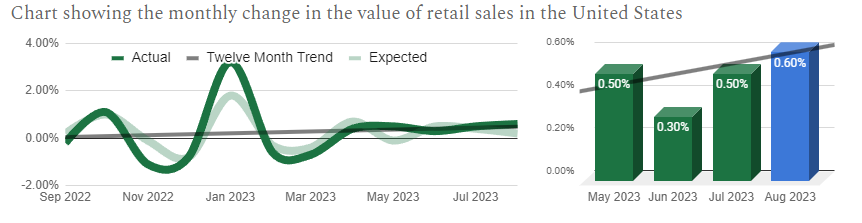 The US retail sales report measures the change in value of aggregated retail goods and services sales over a given month compared with the previous. The latest data covers the August period and was published on September 14th by the Census Bureau and the next version is out on October 17th.