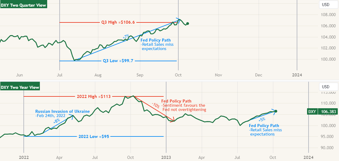 Derbyshire, UK – October 9th, 2023 - This is the currency report for the US Dollar and is intended to be a reference aid for your own analysis and trade planning. This edition has the latest labour market data which showed a surprise upside jump for NFP, revised market narratives and information on the Gaza-Israel conflict. The next update will be after the CPI report on Thursday, October 12th which may be heating up again, or before if any significant event occurs.